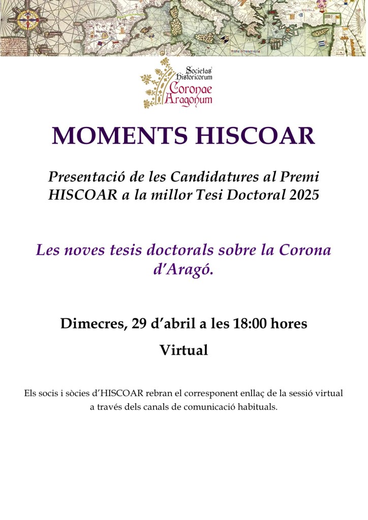 The Association of Historians of the Crown of Aragon (Societas Historicorum Coronae Aragonum, HISCOAR) aims to contribute to facilitating relations and exchanges between researchers who, anywhere in the world, focus their research on the Crown of Aragon.